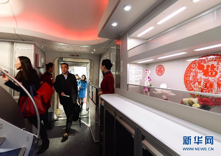 2月4日,在国航北京至广州航班上,布置一新的机舱内处处透露着过年的气息。当日,2015年春运拉开帷幕。2015年春运期间,中国国际航空公司较去年同期多投入9%的航班座位数,以保证乘客探亲、返乡和旅游的需要。新华社记者 李贺 摄