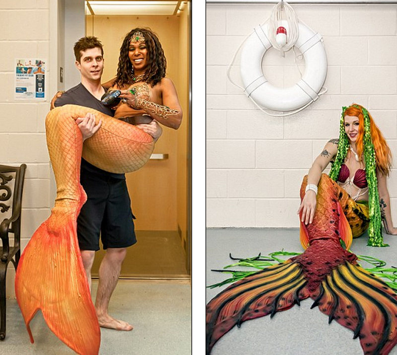 除了尾巴外,“人鱼”还要用假发、头饰以及经典贝壳胸罩装点自己。(网页截图)