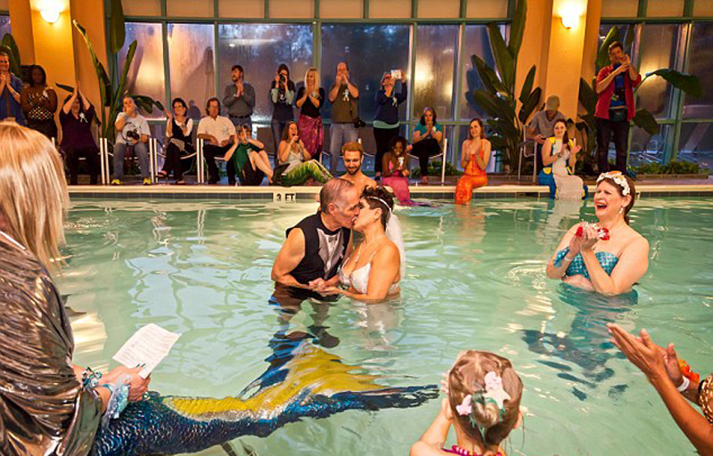 第一对“人鱼”举行了婚礼,祝福者们以“尾巴”击水祝福这对新人。(网页截图)