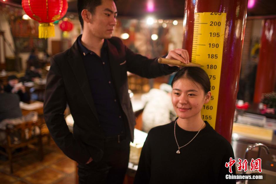 2月3日,在山西太原一家火锅店内,许多顾客排队等待量身高。在这个餐厅就餐,个子越高,优惠折扣越大,这一举措吸引了不少人前来就餐。在餐厅门口,一旁的柱子上标有身高尺寸,凡是进店的顾客都要拖掉鞋,量出准确身高。身高1米8以上的女性和身高1米9以上的男性均可打折。中新社发 张云 摄