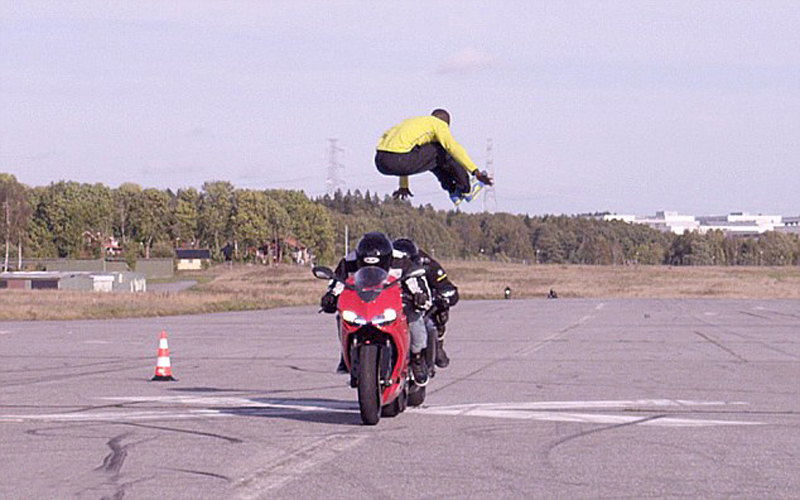 瑞典的特技演员Alassan Issa Gobitaca因跨越车辆而爆红网络,图为他成功挑战过跨越疾驰的摩托车。