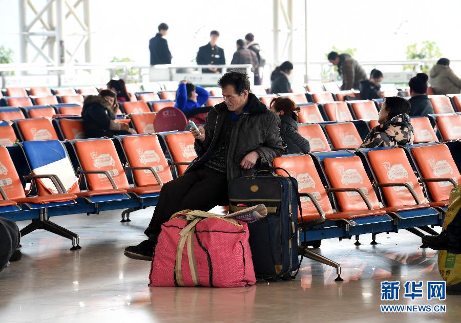2月4日,旅客在铁路南京站候车厅内候车。当日,2015年春运拉开帷幕。因高校学生寒假返乡高峰已在1月底结束,而探亲、旅游客流高峰尚未到来,春运首日南京火车站客流量与平时基本持平,秩序井然,部分临客仍有余票。新华社记者 孙参 摄