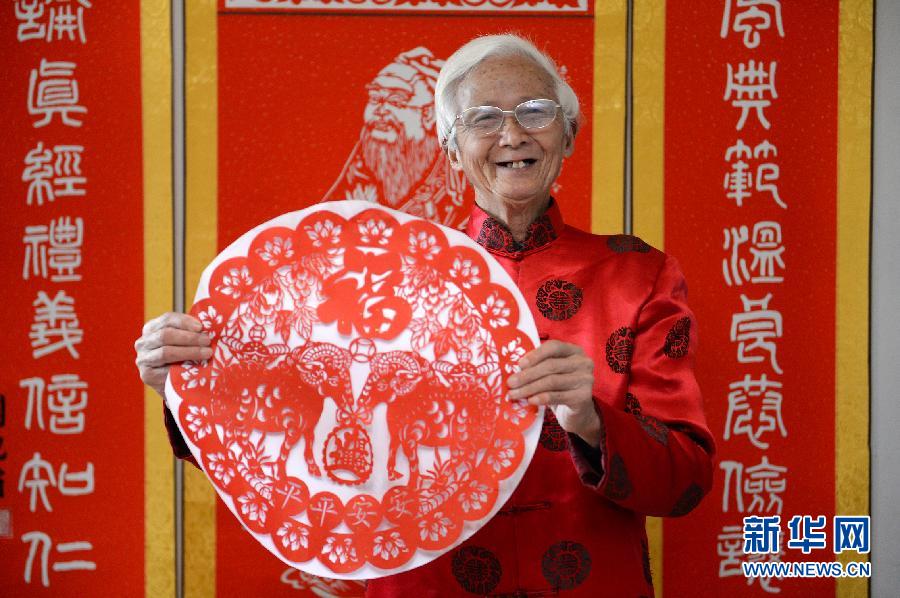 刘纪甫展示为新年创作的剪纸作品《双羊送福》(2月4日摄)。春节临近,江西省南昌市79岁的刘纪甫老人创作了系列“生肖羊年”题材的剪纸作品,喜迎羊年。刘纪甫老人曾是一名普通工人,退休后钻研面塑、剪纸、版画等民间艺术,作品曾入选全国九年义务教育美术教科书,并被授予“南昌市非物质文化遗产传承人”称号。新华社记者 万象 摄