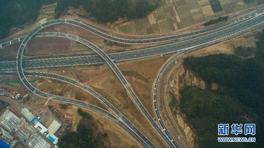 2月5日,空中俯瞰东永高速公路。当日,浙江省东阳市供电公司的电力工人为浙江省最短高速公路——东永高速公路进行通车前的最后一次电力设备巡视工作,为开通做准备。该高速公路连通浙江中部的东阳市和永康市,全长44.699公里,是目前浙江省内已建成的最短的高速公路。 2015年1月底,东永高速公路已顺利通过交工验收,开通在即。该高速路段编号为S27,是浙江省“十一五”重大建设项目,连接东阳市和永康市,其中东阳段13.844公里、永康段30.855公里;按照双向四车道高速公路标准设计,主线设计速度100公里每小时。通车后将使浙江省内杭金衢、金丽温、甬金、诸永等高速公路有机地连通在一起,大大改善浙江中部地区的高速交通条件。新华社记者 徐昱 摄