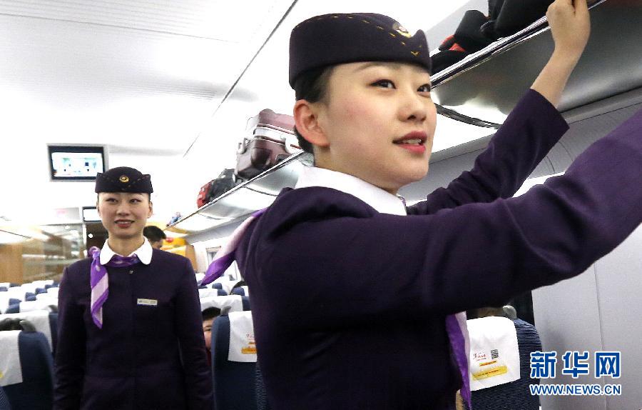 当日是2015年春运第二天。铁路上海客运段的双胞胎姐妹章怡倩、章怡盼被抽调到客流集中的上海虹桥至广州南G85次列车上帮班服务,这也是她们共同为旅客服务的第4个春运。在全段班组中开展的“春运攻坚当先锋,亲情服务做表率”主题活动中,姐妹俩积极的工作态度和贴心服务得到旅客认可。新华社记者 陈飞 摄