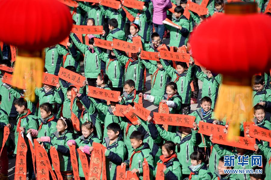 2月5日,莲花小学的学生们展示自己亲手书写的春联。临近新春,安徽省合肥市书法特色学校莲花小学的300余名小学生书写百余幅春联,并将陆续送给身边的独居老人以及即将回家过年的农民工,表达新春的祝福。新华社记者 郭晨 摄