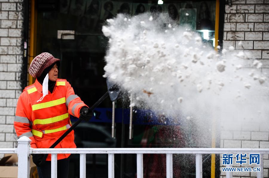 2月5日,一名环卫工人在清理西宁街道上的积雪。受冷空气影响,从2月5日凌晨开始,青海省多地出现降雪天气,高原古城西宁市也迎来立春后的首场降雪。 新华社记者吴刚摄