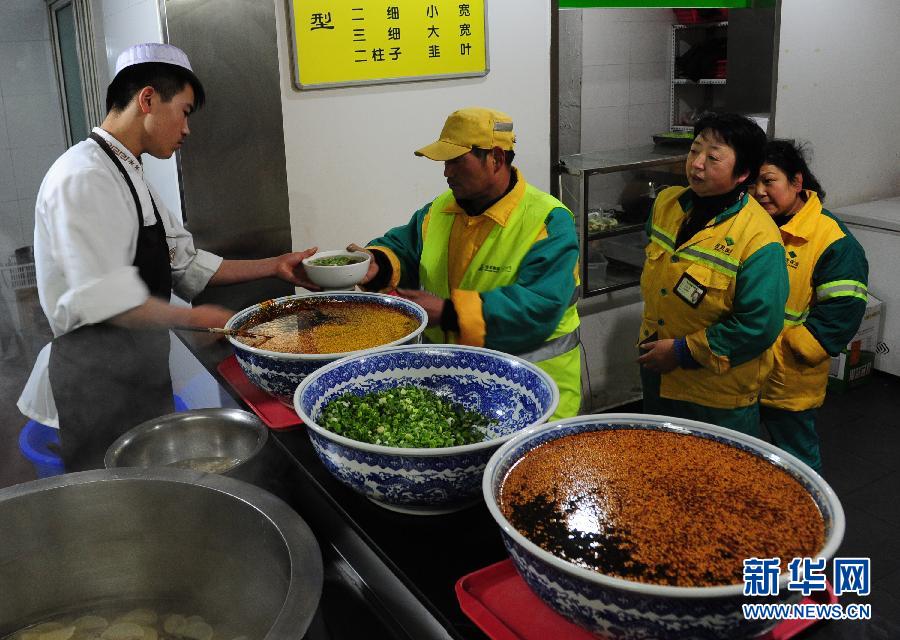 2月5日,在西安市凤城三路上的马子禄牛肉面馆,环卫工在排队等面。 “环卫工人可在本店免费享用牛肉面”——陕西西安凤城三路上的马子禄牛肉面馆挂着醒目的提示牌。老板李志介绍,面馆于2013年3月份开业。前一阵他来店里,看见天还没亮环卫工就在外面工作,非常冷,就把他们叫到店里休息一下;后来他转念一想,请他们吃碗热面条更管用,于是从2014年12月20日开始免费请环卫工吃面。目前,面馆每天制作牛肉面700碗左右,其中免费请环卫工吃的有100碗。李志表示,只要生意不错就一直免费请下去。 新华社记者 丁海涛 摄