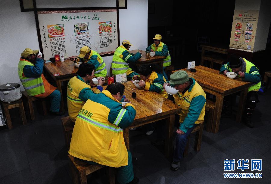 2月5日,在西安市凤城三路上的马子禄牛肉面馆,环卫工在吃面。 “环卫工人可在本店免费享用牛肉面”——陕西西安凤城三路上的马子禄牛肉面馆挂着醒目的提示牌。老板李志介绍,面馆于2013年3月份开业。前一阵他来店里,看见天还没亮环卫工就在外面工作,非常冷,就把他们叫到店里休息一下;后来他转念一想,请他们吃碗热面条更管用,于是从2014年12月20日开始免费请环卫工吃面。目前,面馆每天制作牛肉面700碗左右,其中免费请环卫工吃的有100碗。李志表示,只要生意不错就一直免费请下去。 新华社记者 丁海涛 摄