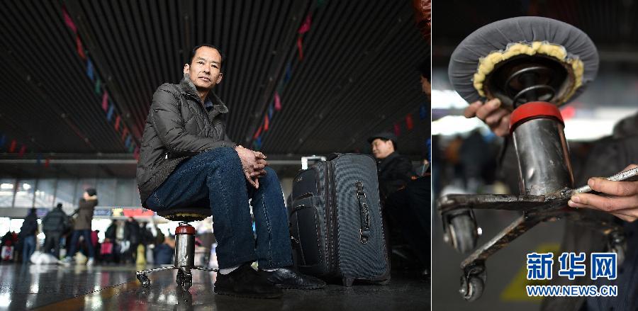 在宁夏银川火车站,今年50岁的打工者李建华坐在自制的小板凳上候车,喜好发明创造的他,今年回山东老家只买到了站票,索性利用废弃材料自制了一把弹簧凳方便休息(拼版照片,2月4日摄)。春运路上,外来务工返乡人员随身携带着不同的物件,常年不离身的、自制的、家用必备的,为他们的返乡之旅提供帮助和便利。 新华社记者 李然摄