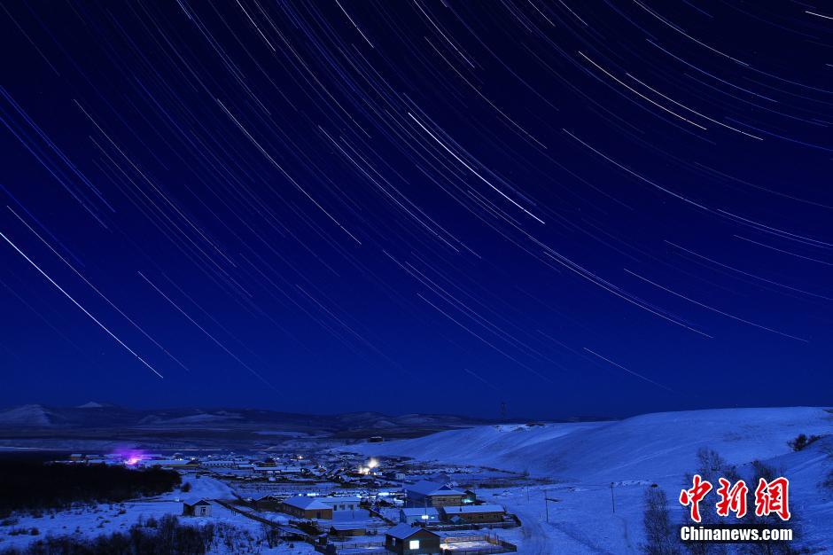 2014年10月至2015年1月,中俄边境、内蒙古呼伦贝尔市雪夜星轨。 中新社发 刘兆明 摄 图片来源:CNSPHOTO