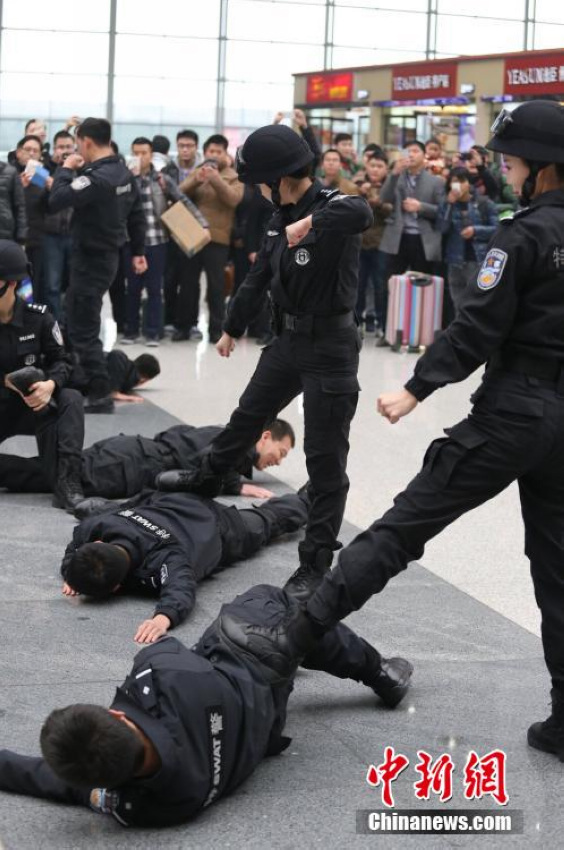 2015年春运4日开启,郑州铁路公安局4000名干警围绕突发客流、恶劣天气、旅客滞留、重大事件等制定应急措施,从交通、装备、通讯、保障等方面进行预想预判,超前加强预案学习、演练,强化提升实战指挥能力和一线民警的应变能力,确保春运安全。图为2月3日,河南郑州,铁路公安女特警在郑州东站侯车大厅向旅客进行擒拿格斗演示。(杨正华)
