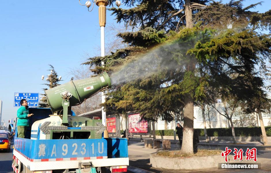 2月5日,在河北石家庄市裕华路主干道上,风筒车和洒水车正在对路边的雪松进行冲洗,原本灰头土脸的大树,经过喷洒冲洗立刻露出了原本绿色。 中新社发 翟羽佳 摄
