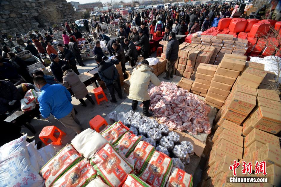 2月4日,河北省永年县广府镇东街村党支部书记宋福如投入220多万元为全村人置办年货,使全村的2880名村民每人领到了一份年货,喜迎新春佳节的到来。据悉,年货标准为每人12样年货,即2斤带鱼、1只土鸡、2斤猪后座、1桶花生油、20斤东北大米、1斤香油、20斤精粉、10斤饺子粉、1斤糖、1斤瓜子、2斤花生、1.5斤粉条,让全村人过春节不用买年货,受到全村村民的欢迎。另外,60-69岁老人发放生活补助金1200元,70-79岁老人发放生活补助金1800元,80-89岁老人发放生活补助金2400元,90岁以上老人发放生活补助金3000元。 据了解,宋福如连续6年为村民置办年货,免费为村民发放米、面、油,免费为村民体检,全村村民免费享受新农合、新农保,被村民誉为“免费村支书”。中新社发 郝群英 摄 图片来源:CNSPHOTO