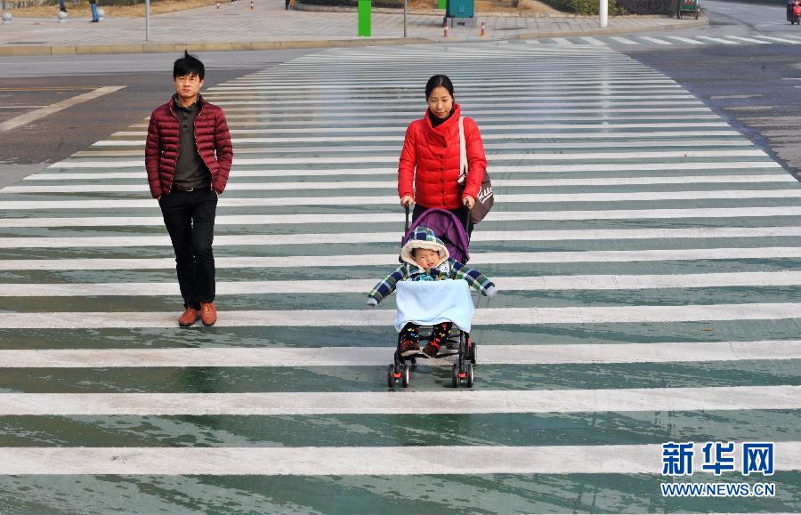 2月5日,行人通过长沙市金星路上的绿白相间斑马线。近日,一组绿白相间的斑马线亮相湖南省长沙市金星路。据介绍,这是长沙首次推行的“绿道”。“绿道”采用绿白相间横条纹作为斑马线,提醒行人过街要走斑马线,也提醒过往司机减速慢行。新华社记者 龙弘涛 摄