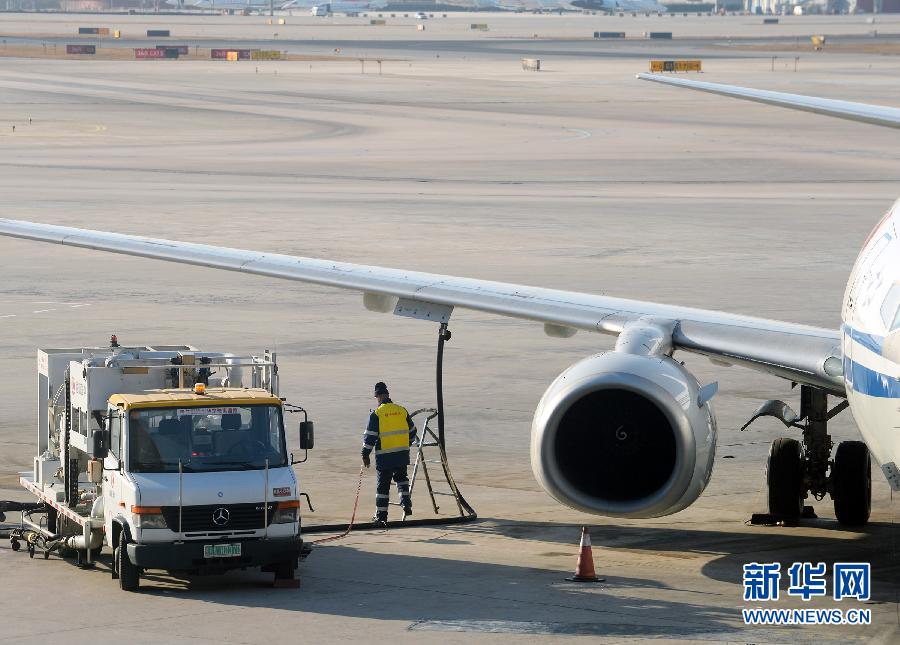 2月5日,在北京首都国际机场停机坪上,加油车在为飞机加装油料。当日起,受国际油价持续下跌影响,国内航线取消燃油附加费。 新华社记者 李贺 摄