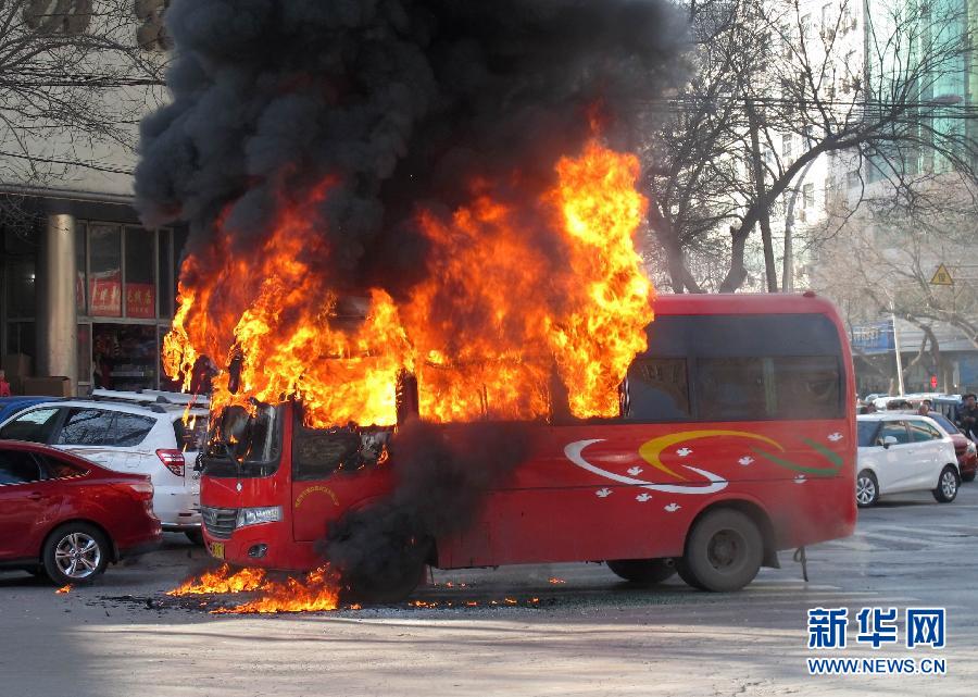 2月5日,一辆中巴车在河北石家庄新华路和公里街交口处自燃,中巴车烧成了空壳,没有造成人员伤亡。 新华社发(孙晓龙摄)