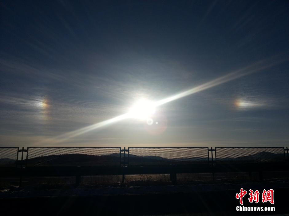 2月5日下午15时,内蒙古扎兰屯市中和镇上空惊现“幻日”奇观,两个“小太阳”对称分列于真正大太阳的两侧,当地群众纷纷拿出手机抓拍下这一珍贵瞬间。据了解,幻日是大气的一种光学现象。当漂浮在天空半透明薄云里六角形柱状的冰晶体,偶尔整齐垂直排列时,阳光通过这些六角形冰柱时,便会发生这种非常规律的折射现象。中新社发 李宏 摄 图片来源:CNSPHOTO