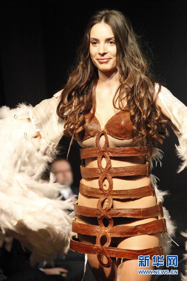 2月5日,在比利时布鲁塞尔,模特身穿巧克力制作的时装在第二届布鲁塞尔巧克力沙龙的贵宾日上走秀。 新华社记者王晓郡摄