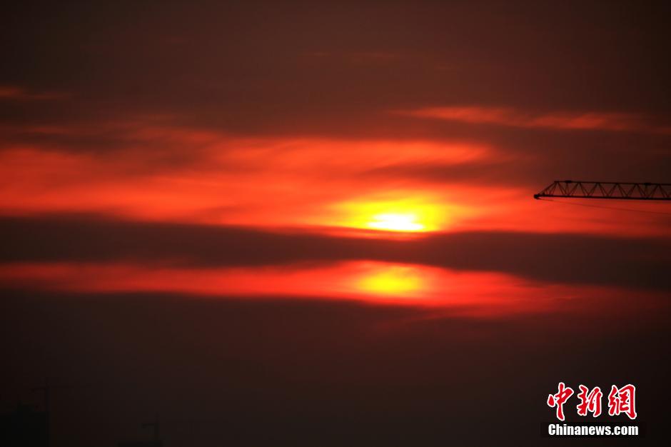 2月6日清晨,河南省郑州市东方出现绚丽朝霞。日出时分,一片乌云似将太阳一分为两半。 中新社发 冯磊 摄 图片来源:CNSPHOTO