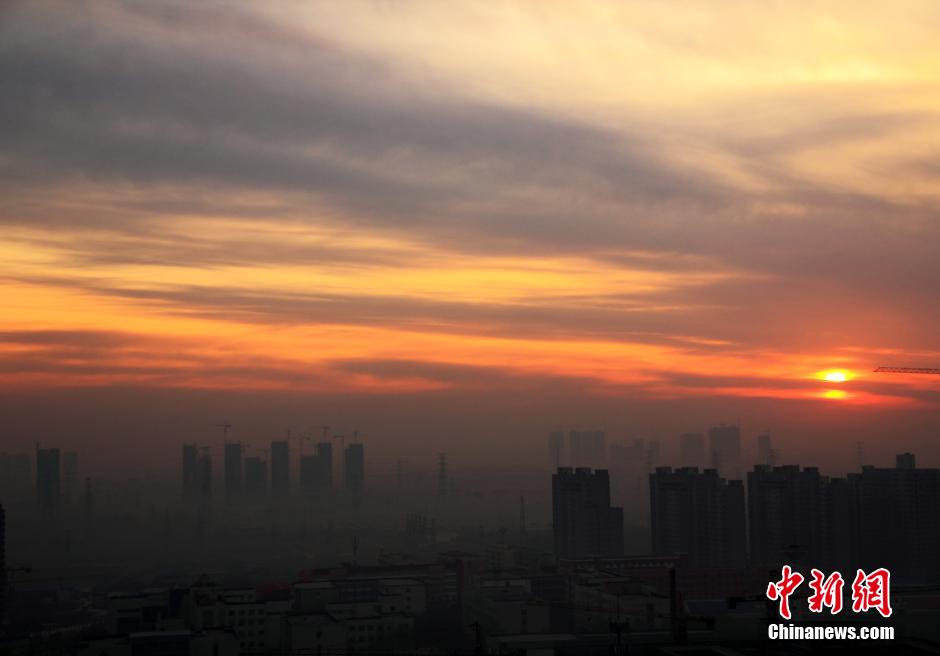 2月6日清晨,河南省郑州市东方出现绚丽朝霞。日出时分,一片乌云似将太阳一分为两半。 中新社发 冯磊 摄 图片来源:CNSPHOTO