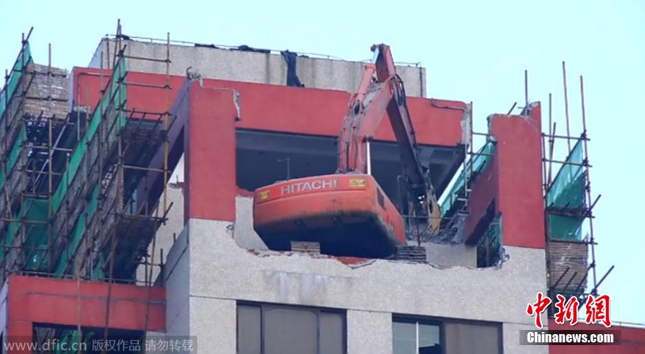 2015年2月6日,上海,位于苗圃路靠近昌邑路路口的一个拆迁工地的一栋高层建筑顶楼,惊现一台大型挖掘机正在进行作业,场面十分震撼。图片来源:东方IC 版权作品 请勿转载