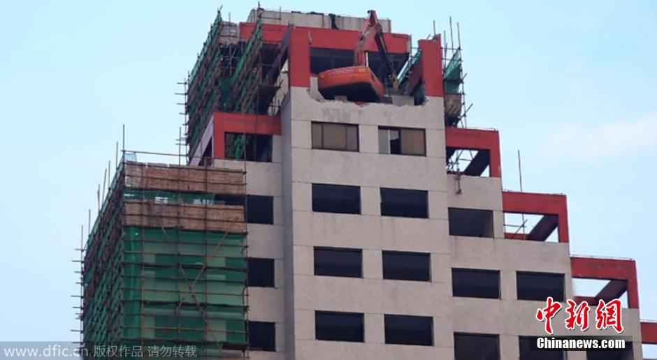 2015年2月6日,上海,位于苗圃路靠近昌邑路路口的一个拆迁工地的一栋高层建筑顶楼,惊现一台大型挖掘机正在进行作业,场面十分震撼。图片来源:东方IC 版权作品 请勿转载