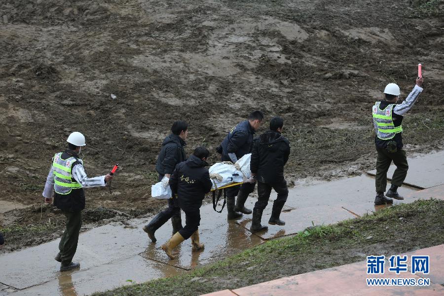 2月6日,救援人员在抬送遇难者遗体。