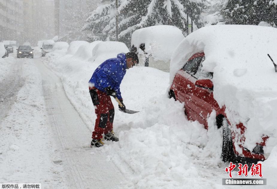 当地时间2月5日,西班牙北部遭暴风雪袭击,掩埋车辆,交通受阻。图为北部巴里奥斯卢纳附近的人们试图挖出埋在雪中的汽车。