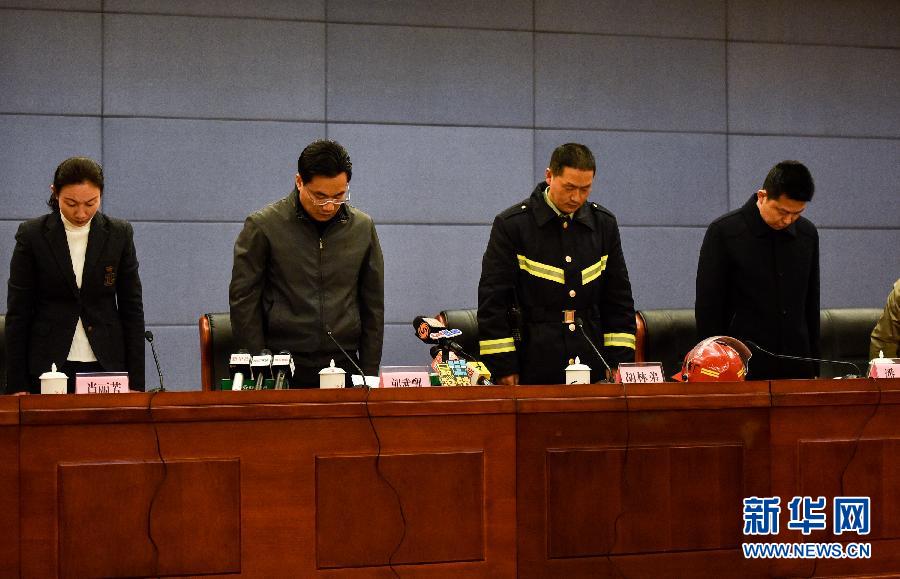 2月6日,在惠东商场火灾新闻发布会现场,出席会议的人员为逝者默哀。新华社记者 毛思倩 摄