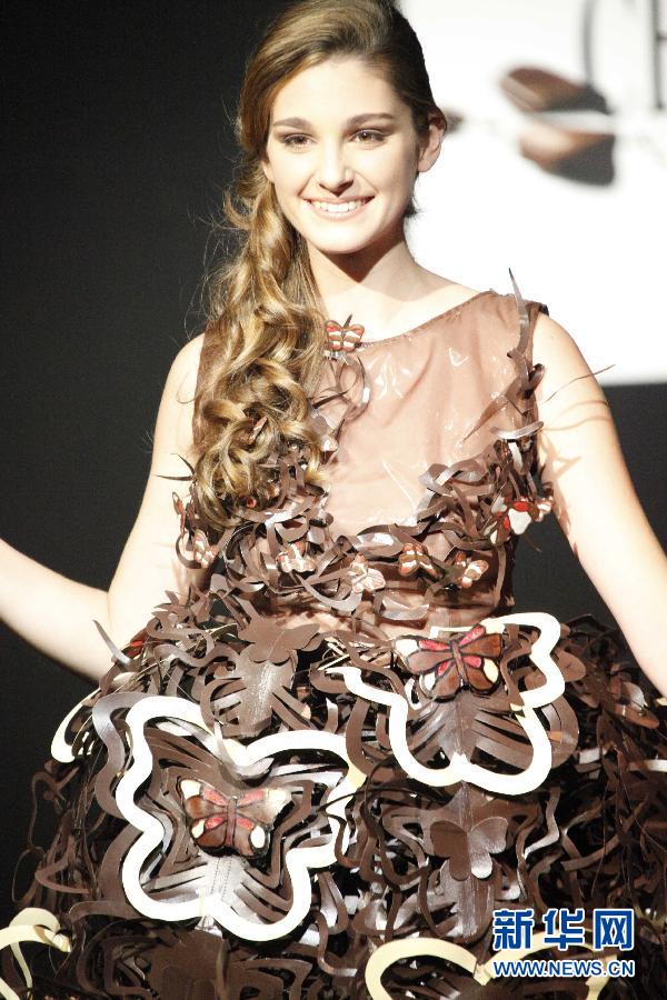 2月5日,在比利时布鲁塞尔,模特身穿巧克力制作的时装在第二届布鲁塞尔巧克力沙龙的贵宾日上走秀。  新华社记者王晓郡摄