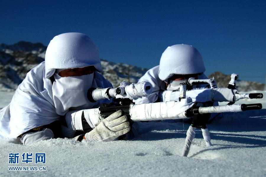 2月7日,博尔塔拉蒙古自治州公安边防支队机动部队官兵在进行野外伪装狙击。 2月7日,新疆博尔塔拉蒙古自治州公安边防支队机动部队官兵来到边境山区的陌生环境,冒着零下二十摄氏度的严寒开展野外拉练。拉练过程中设置了雪地突击、野外狙击、雪地耐寒等训练课目,以此锤炼、检验部队在野外极寒条件下快速反应和反恐处突能力。新华社发(张佳 摄)