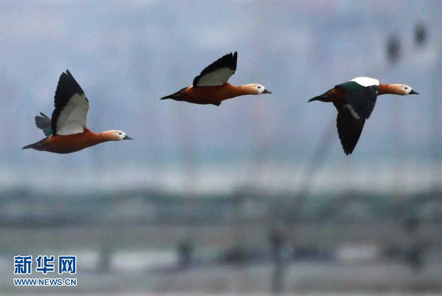 这是2月8日在江苏省盱眙县穆店乡境内的龙泉湖拍摄的赤麻鸭。近日,江苏省淮安市盱眙县龙泉湖内出现了近20只来此越冬的赤麻鸭。赤麻鸭为国家一级保护动物,已被列入《世界自然保护联盟》2012年濒危物种红色名录。新华社发(周海军 摄)