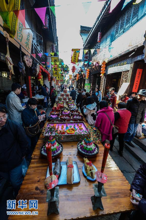 2月8日,塘栖古镇水北老街上摆满了传统风味的米塑、糕点、酱鸭等,增添了浓浓的年味。临近春节,传统民俗年味迎新春活动在浙江杭州塘栖古镇举办,活动将持续至农历正月十五。除听古戏、打年糕、磨米粉、送春联等多项传统民俗活动外,还有多种江南民俗表演,以及跳绳、滚铁环、打陀螺等儿时游戏。杭州塘栖古镇历史悠久,始建于北宋,繁盛于明清。京杭大运河穿镇而过,是远近闻名的“鱼米之乡”“丝绸之府”。 新华社记者 徐昱 摄