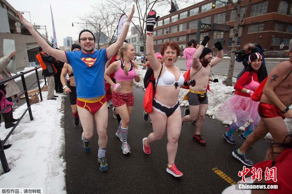 当地时间2015年2月7日,美国纽约,寒冷的冬天也不能阻挡民众的热情,丘比特内衣赛跑盛大举行。