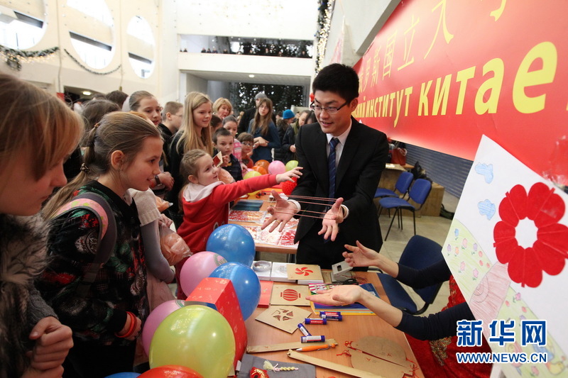 在明斯克国家青少年宫,当地小朋友同中国留学生一起玩中国民间游戏。新华社记者陈俊锋 摄