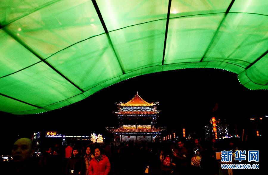 2月7日晚,2015年西安城墙新春灯会在有600多年历史的西安明城墙亮灯开幕。本次灯会设有宫灯之王、财神送福、海底世界、绿色仙境、幽幽谷等系列,盏盏花灯组成了一条条曲折的路线,游客游走于花灯的“丛林”中,穿梭在花灯的“隧道”里,尽情体验“唐都上元不夜月,火树银花西安城”的繁华气派。灯展将持续至3月22日。新华社记者 刘潇 摄