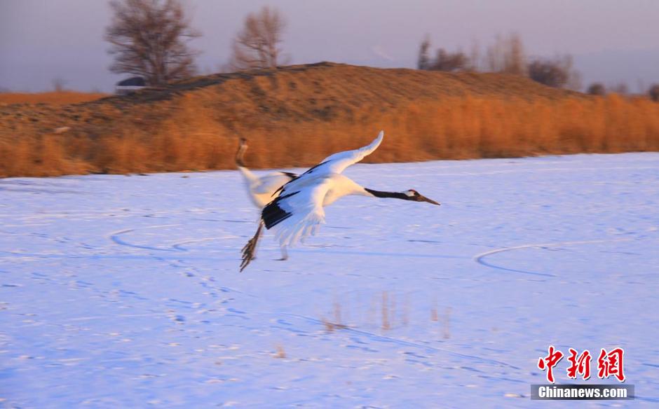 2月9日,伴着朝阳,国家一级保护动物丹顶鹤在地处甘肃河西走廊的张掖国家湿地公园“闲庭散步”、“起舞”游玩。2014年3月,张掖国家湿地公园从黑龙江齐齐哈尔扎龙自然保护区引进14只国家一级保护动物丹顶鹤和2只白头鹤。经过近一年的适应期、合群期,现在有11只丹顶鹤进入放飞期。随着羊年春节的到来,丹顶鹤开始放飞并与游人见面。陈礼 摄
