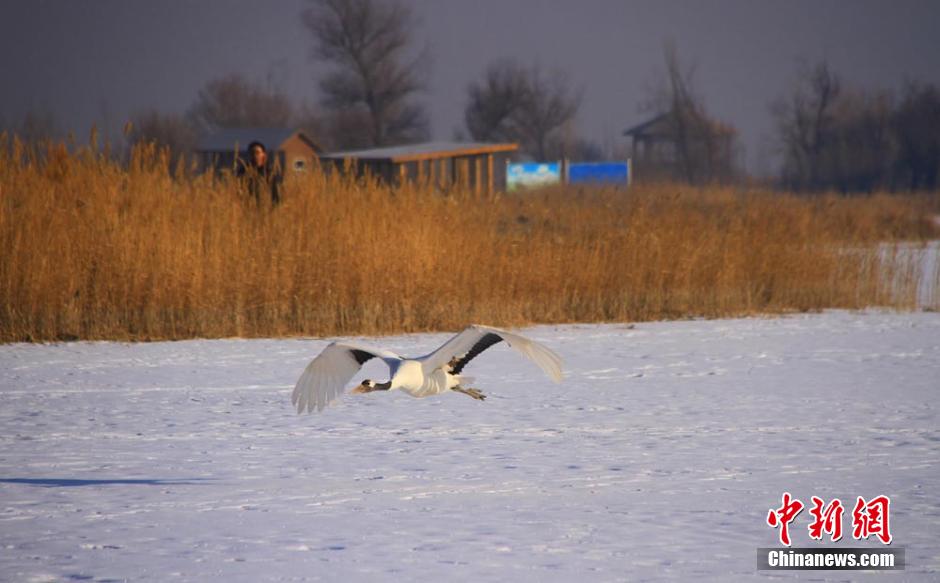 甘肃河西走廊湿地丹顶鹤“起舞”
