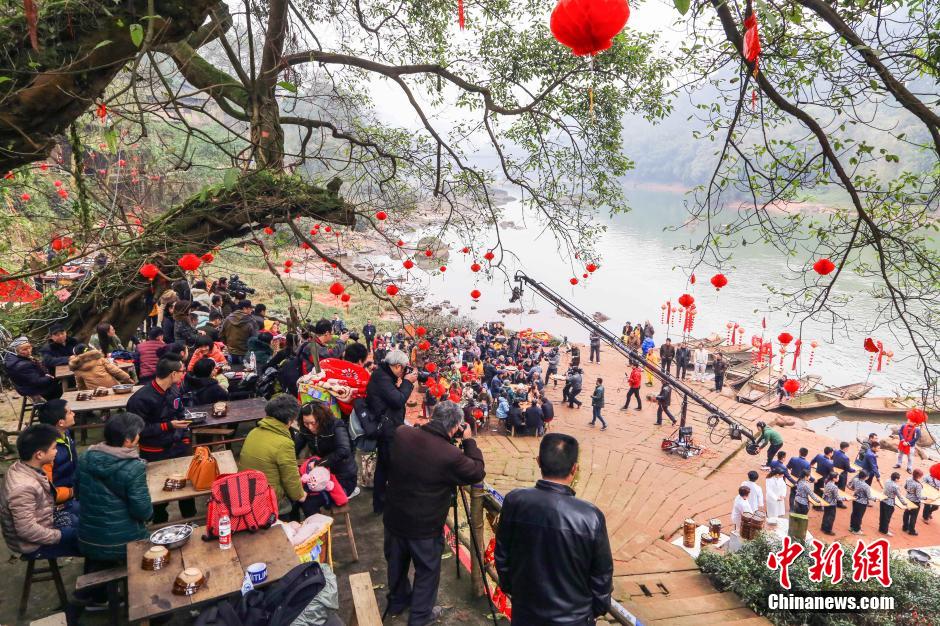 2月8日,一场主题为“寻找记忆中的年味”的“千人长街宴”团年饭活动在中国历史文化名镇——赤水市大同古镇拉开帷幕。古镇全长近2000米的古街道上,长街宴呈“一字长蛇阵”摆开,来自贵州、四川、重庆、湖南等地的3000余名游客与古镇居民一道在这里尽享美景美食,感受过年时浓浓的民风民俗。图为厨师正在切腊肉。 喻德江 摄