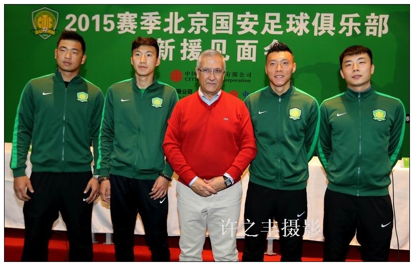 2015年2月9日,北京国安召开了新赛季的新援见面会。主教练曼萨诺携于大宝、李磊、晋鹏翔以及门将石笑天与媒体、球迷代表见面。主教练曼萨诺介绍了球队的备战情况,同时提到了2015年中超的竞争将格外激烈。四名新援(图1左起)石笑天、晋鹏翔、主教练曼萨诺、于大宝、李磊一同与记者和球迷代表见面。工人日报-中工网记者许之丰摄影报道