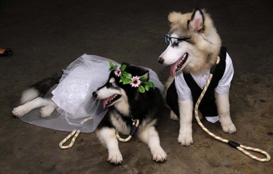 印尼2条阿拉斯加雪橇犬日前举行婚礼。新娘Yipa穿着白色礼服,戴着花环;新郎Buls则穿着马甲,戴着眼镜。(网页截图)