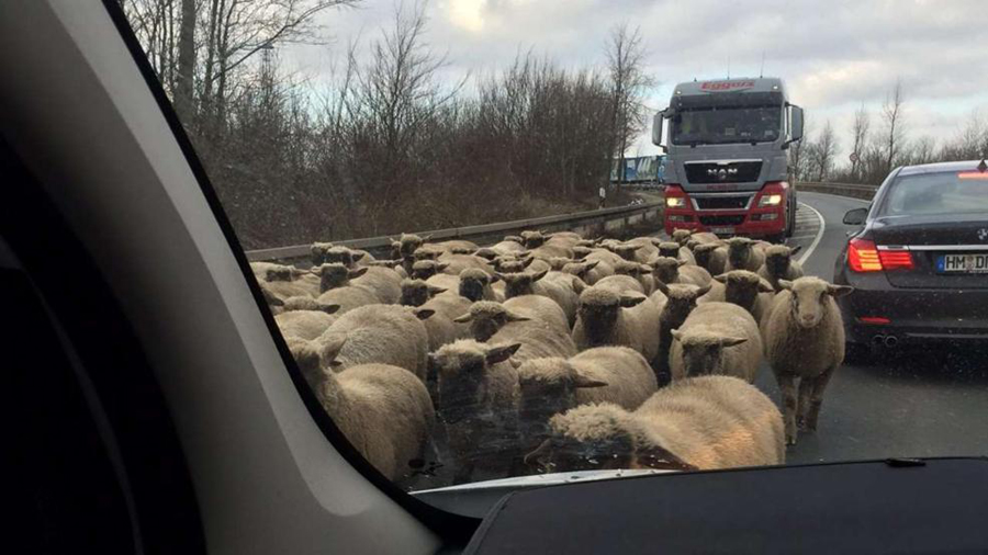 德国上百只绵羊公路“漫步”,旁若无人阻塞交通。