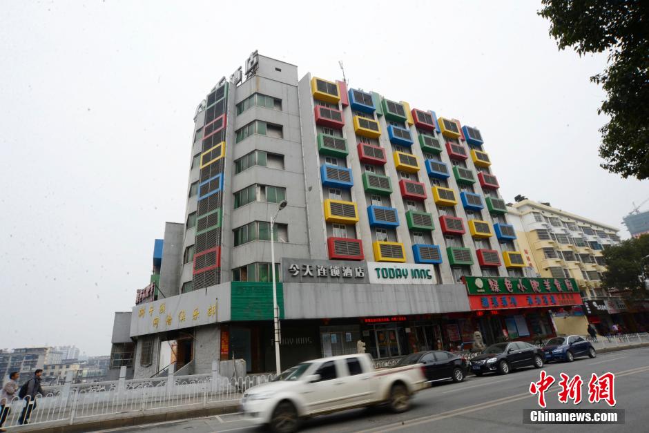 2月9日,在湖南省郴州市飞虹游园旁拍摄的个性“彩虹楼”。在湖南省郴州市飞虹游园旁,有一栋被市民称为“彩虹楼”的楼房,它个性的外观格外吸引人的眼球。据了解,这栋楼房是一家连锁酒店,经营数年,它的外墙上悬挂着40余个红、黄、绿等颜色的空调罩,整齐排列,个性十足。 中新社发 CNSPHOTO 摄 图片来源:CNSPHOTO