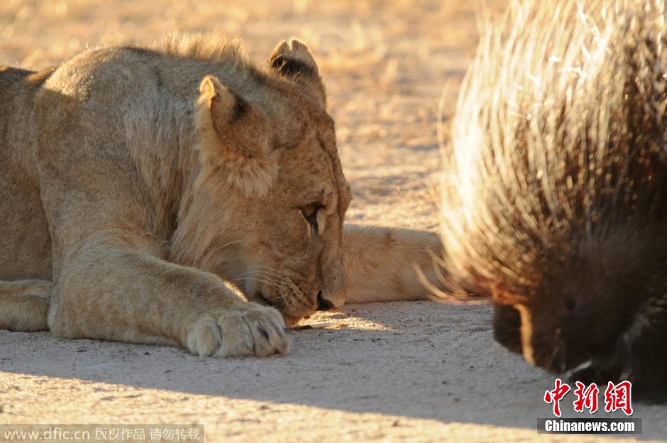 2015年2月9日报道,南非卡拉哈里沙漠,这两只活力四射的豪猪迎来了七头雌狮的围捕,他们用自己身上高高竖起的刺保护着自己,奋力击退了狮群,甚至还刺中了几只幼狮,但不幸的是它们最后还是没能逃脱雄狮的抓捕,成了狮群的腹中餐。 图片来源:东方ic 版权作品 请勿转载