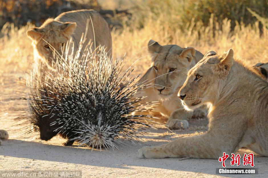 2015年2月9日报道,南非卡拉哈里沙漠,这两只活力四射的豪猪迎来了七头雌狮的围捕,他们用自己身上高高竖起的刺保护着自己,奋力击退了狮群,甚至还刺中了几只幼狮,但不幸的是它们最后还是没能逃脱雄狮的抓捕,成了狮群的腹中餐。 图片来源:东方ic 版权作品 请勿转载