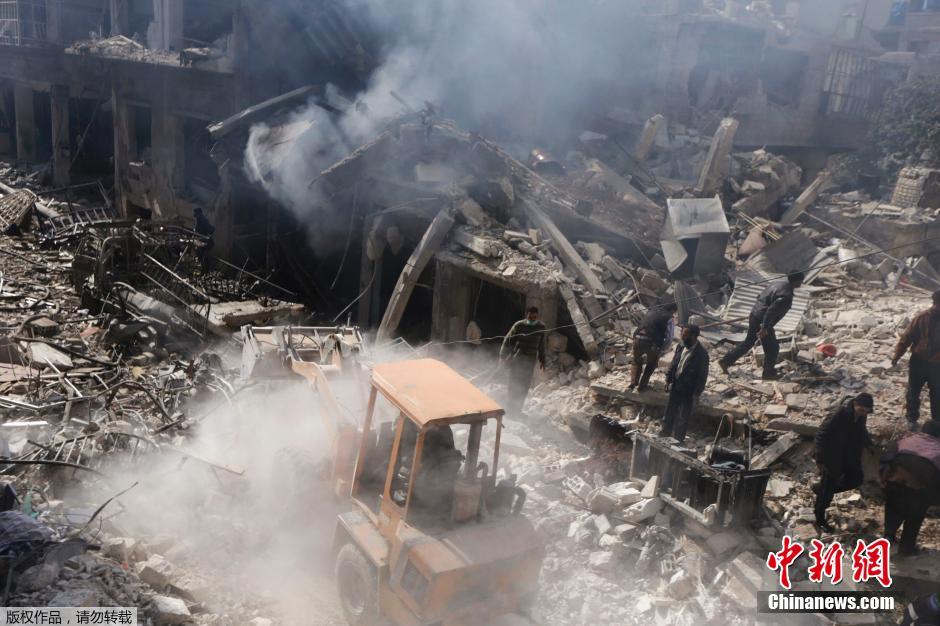 当地时间2015年2月9日,叙利亚大马士革东古塔区,叙利亚政府军空袭当地致23人死亡,50人受伤。
