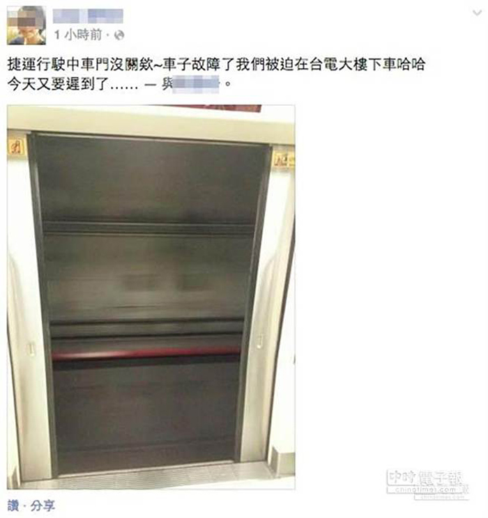 台北地铁今天上午8时59分,一列开往新店的列车其中一节车厢车门没办法关闭,列车开到台电大楼站请360名旅客下车,改搭下一班。