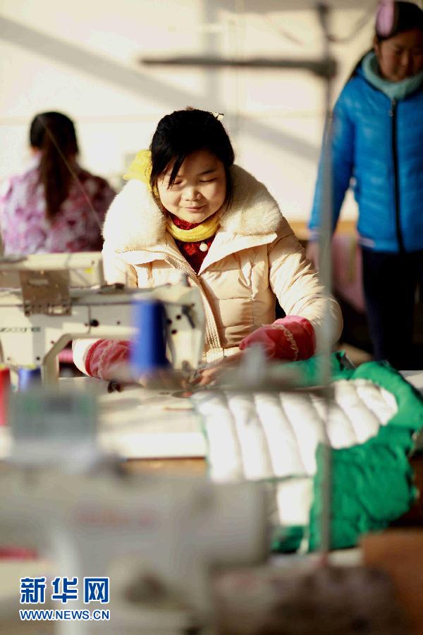 红星村村民林晓在生产羽绒服(1月8日摄)。风景秀丽的庐山南麓,江西九江星子县横塘镇的穷山沟里,“蹦”出了个10亿元级的“电商村”。上世纪80年代之前,横塘镇红星村在全乡穷得出名,人均只有三分田,解决温饱都是问题,人们被迫背井离乡打工。1988年红星村开始兴起羽绒产业,从当年的一家羽绒厂发展到了目前425家羽绒服企业。新华社记者 胡晨欢摄