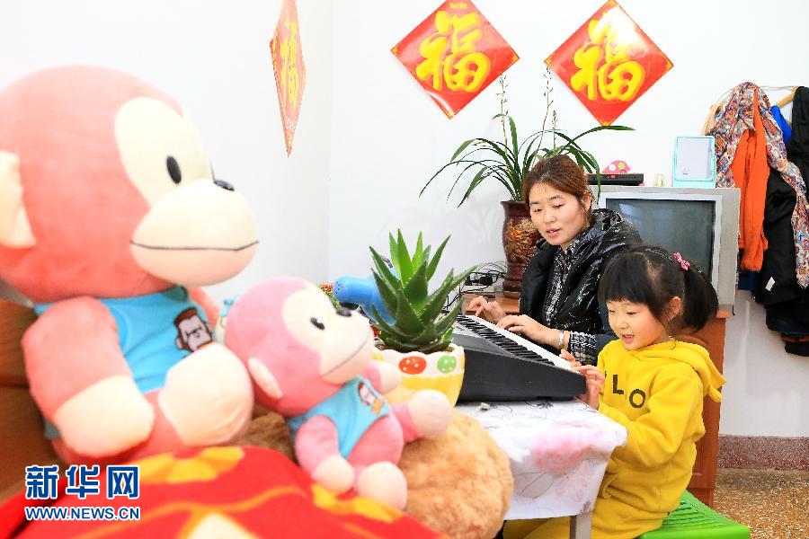 2月10日,农民工孙巧玲在刚刚分到的“夫妻房”里辅导女儿宋怡欣学习电子琴。春节前夕,山东大型纺织服装企业即墨市即发集团为农民工建设的400余套微型“夫妻房”迎来职工入住。该企业建设的微型“夫妻房”面积从20平方米至40平方米不等,卧室、卫生间、厨房、暖气等一应俱全,公司按照业绩排名分配给双职工,免费供他们使用,这不仅减轻了农民工夫妻的租房负担,还让他们有了家的温暖。新华社发(梁孝鹏 摄)